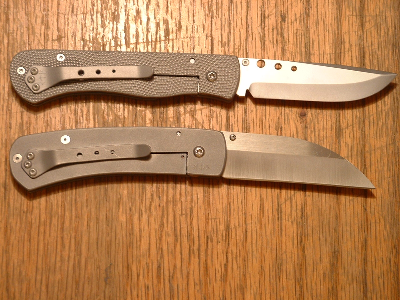 I can't say exactly what it is this hammer forged look does for me but I sure do like it! Its a bit of a challenge to make a differentially hardened blade work in any integral style folder design but when you do get it I must say its pretty dang nice. I used textured hunter orange G10 on this one and its .080 thick so it made for a light weight thin folder. The liners are .070 titanium on this one and the weight is 2.9 ounces. Its 4 and 5/8" closed and sports 3.125" of blade length when opened. The grind is right handed as I said on this one but that just means my left handed sis can experience what the rest of the world has been experiencing with Emerson knives and other chisel grind knives for years. I have a hunch she'll like it. Happy B-day Sis!